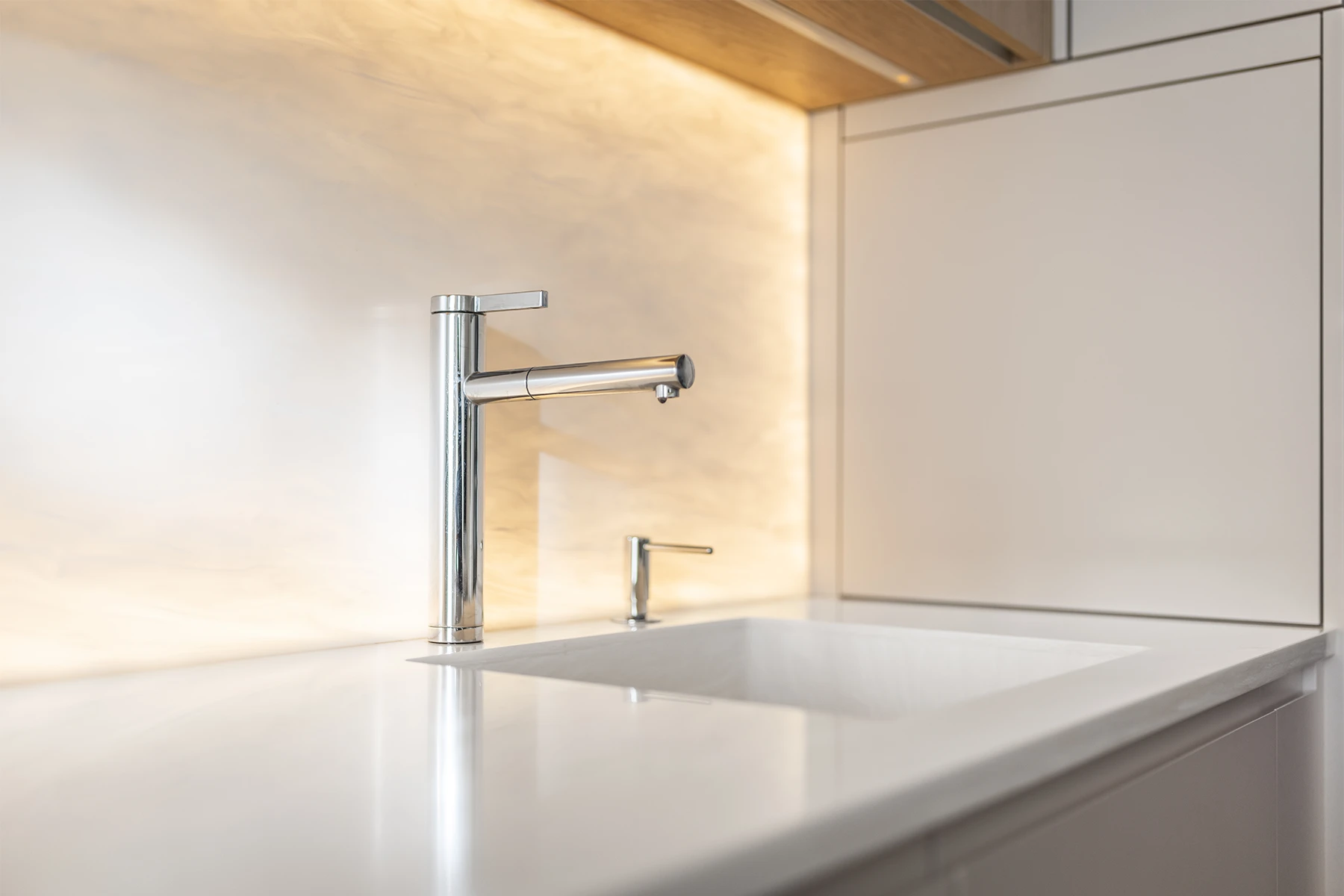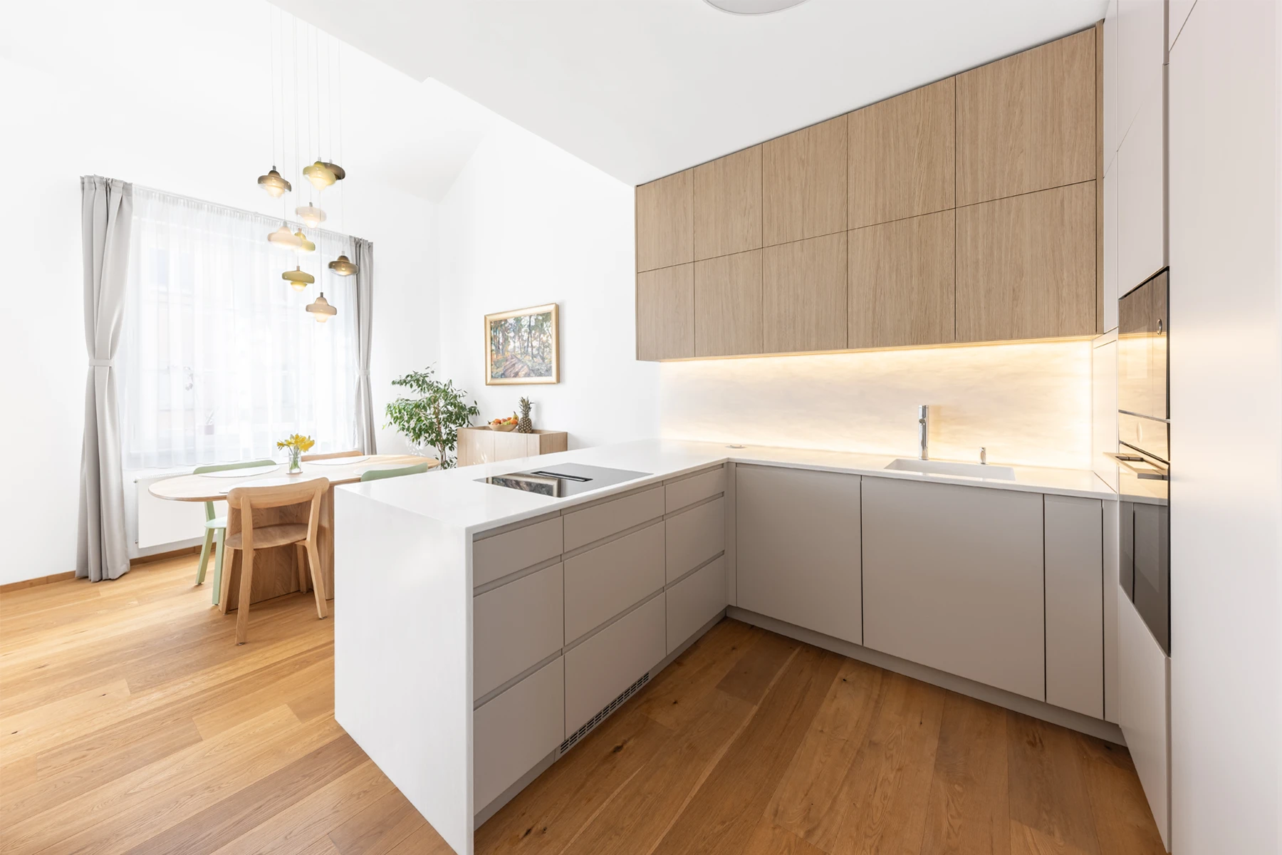 Kuchyně pracuje s bezespárovou pracovní deskou z materiálu KRION a prosvětlenou zástěnou ze stejného materiálu, která večer funguje jako jemné ambientní osvětlení.