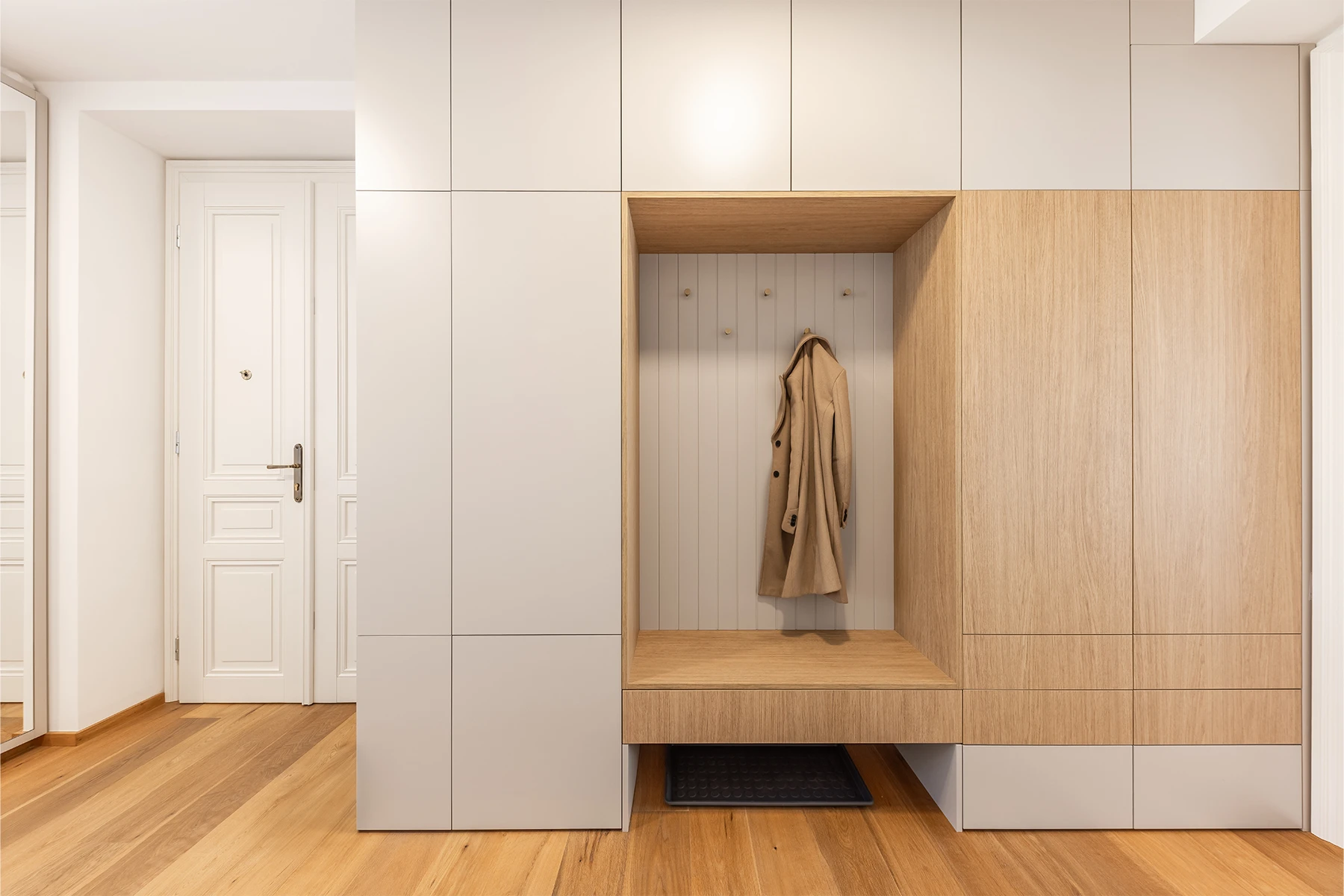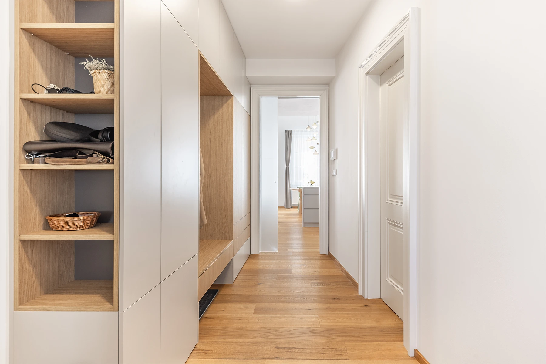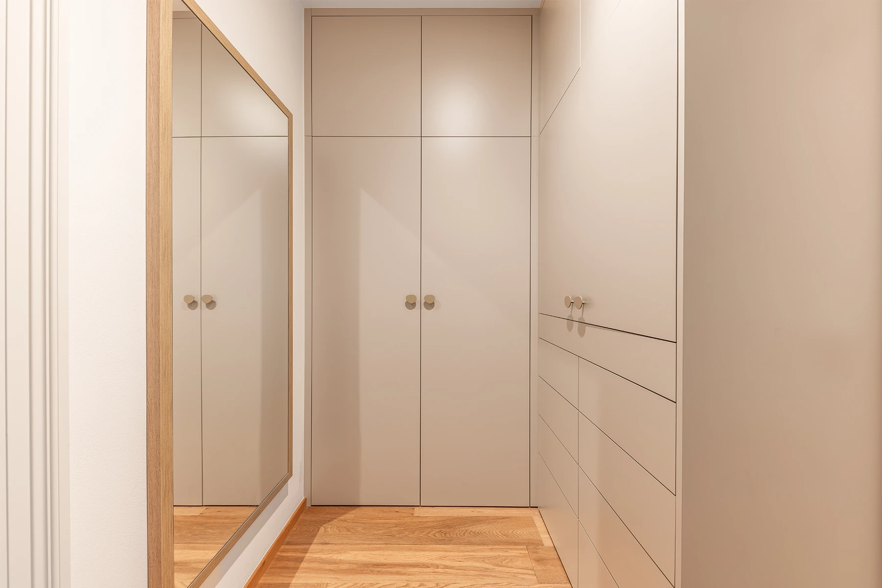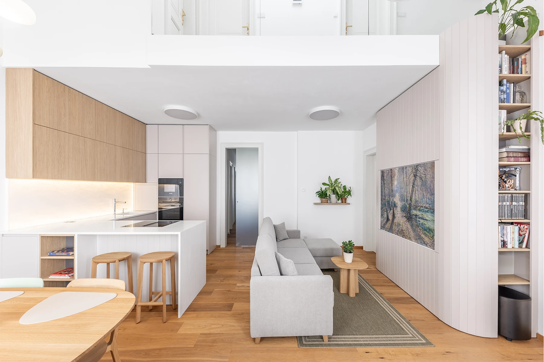 Od začátku bylo jasné jedno: interiér musí obstát v každodenním životě. Nabídnout dostatek úložných prostor, mít jasnou logiku a stát na materiálech, které spolu dlouhodobě fungují. Celý byt jsme proto postavili na kombinaci dubu a kašmíru. Nic víc, nic míň.