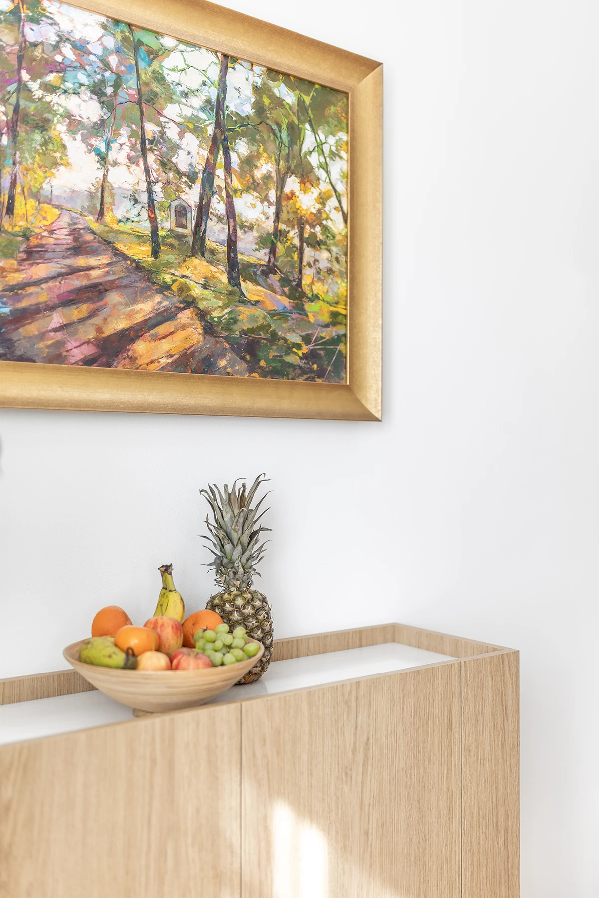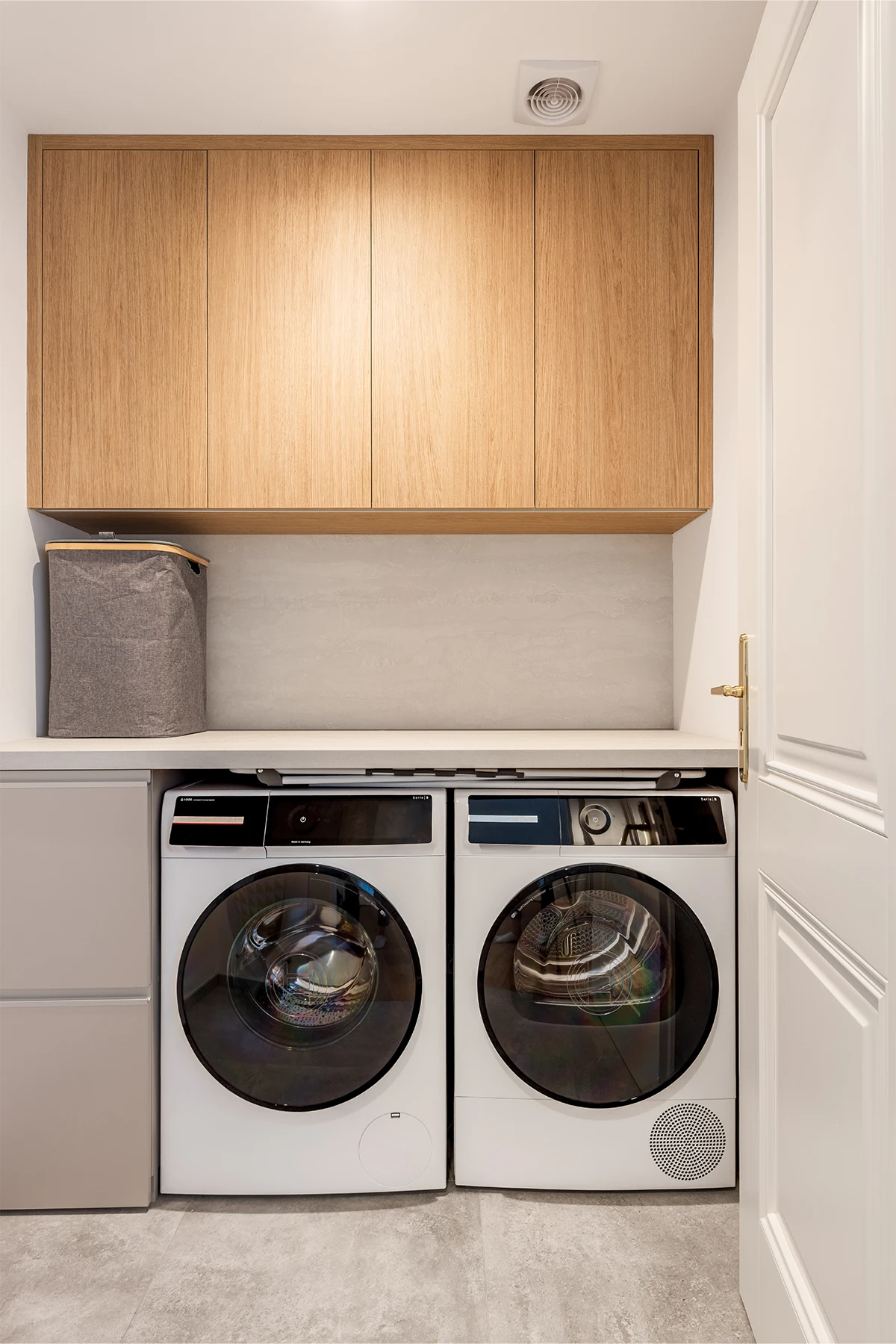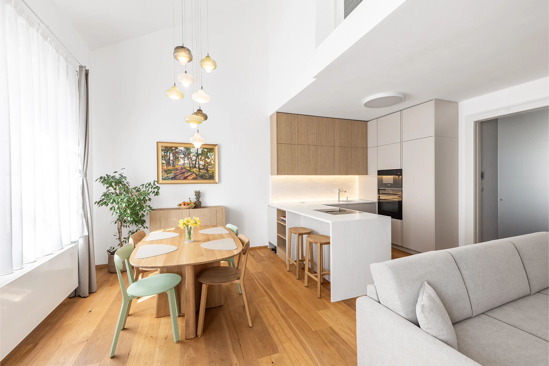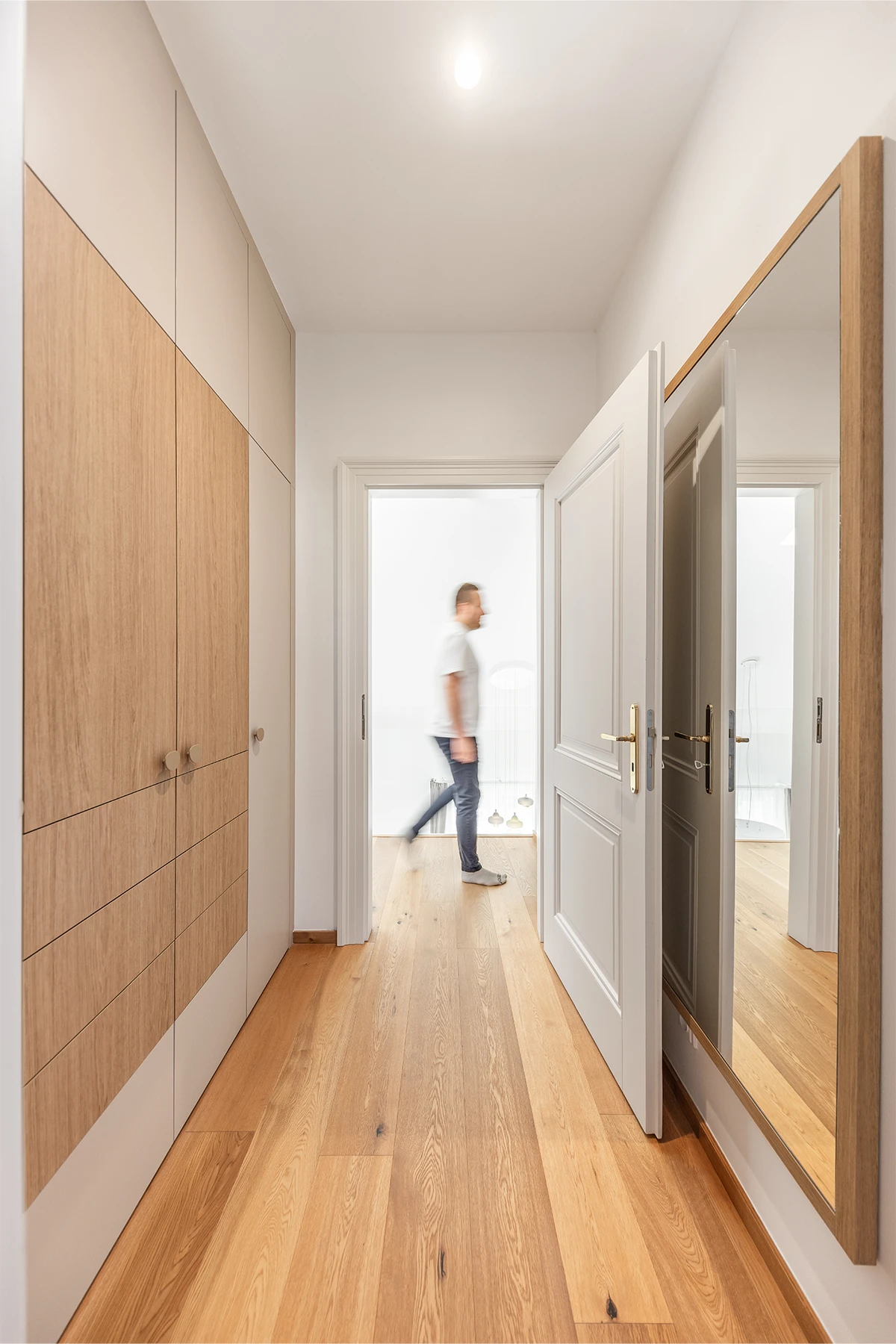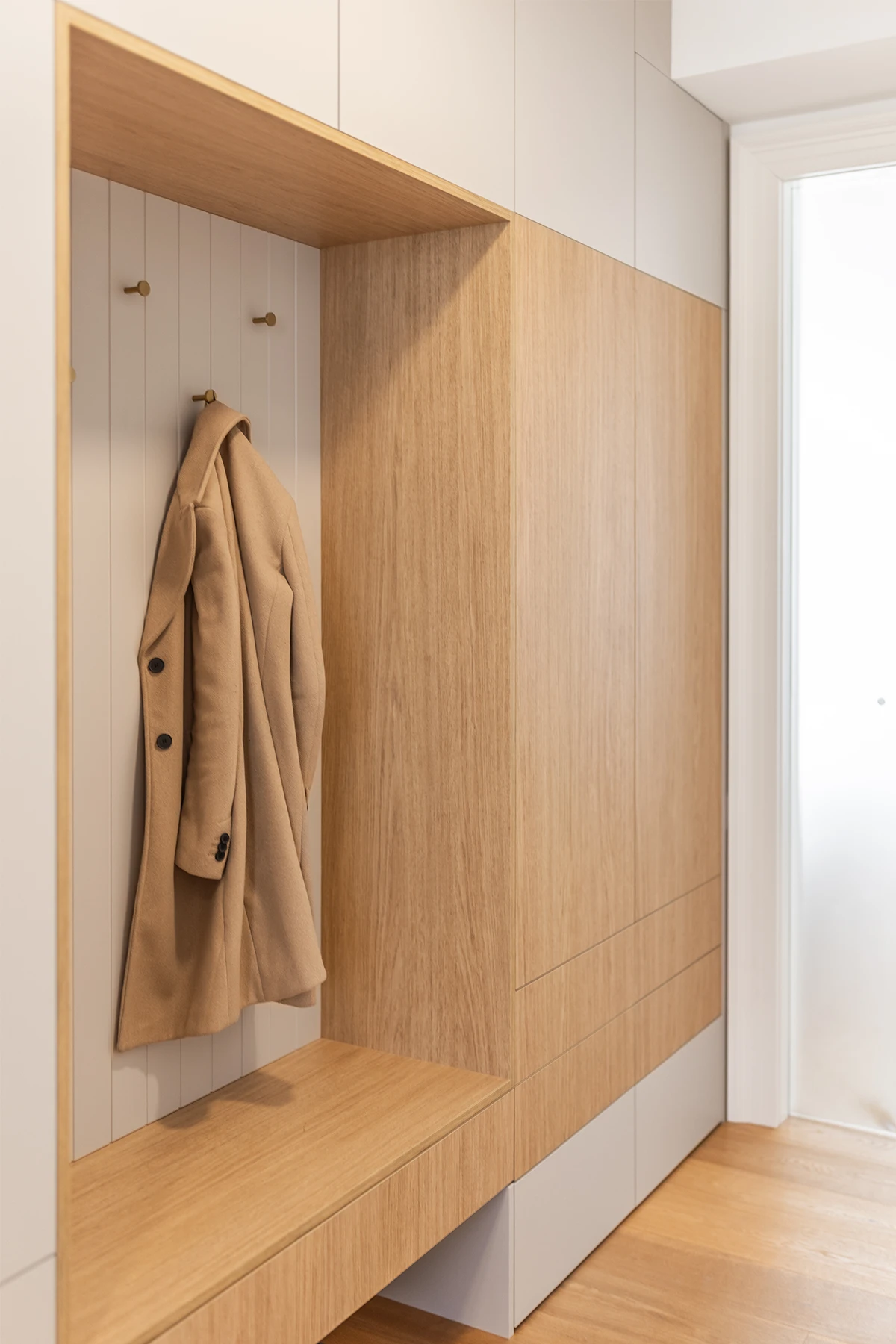 Od začátku bylo jasné jedno: interiér musí obstát v každodenním životě. Nabídnout dostatek úložných prostor, mít jasnou logiku a stát na materiálech, které spolu dlouhodobě fungují. Celý byt jsme proto postavili na kombinaci dubu a kašmíru. Nic víc, nic míň.