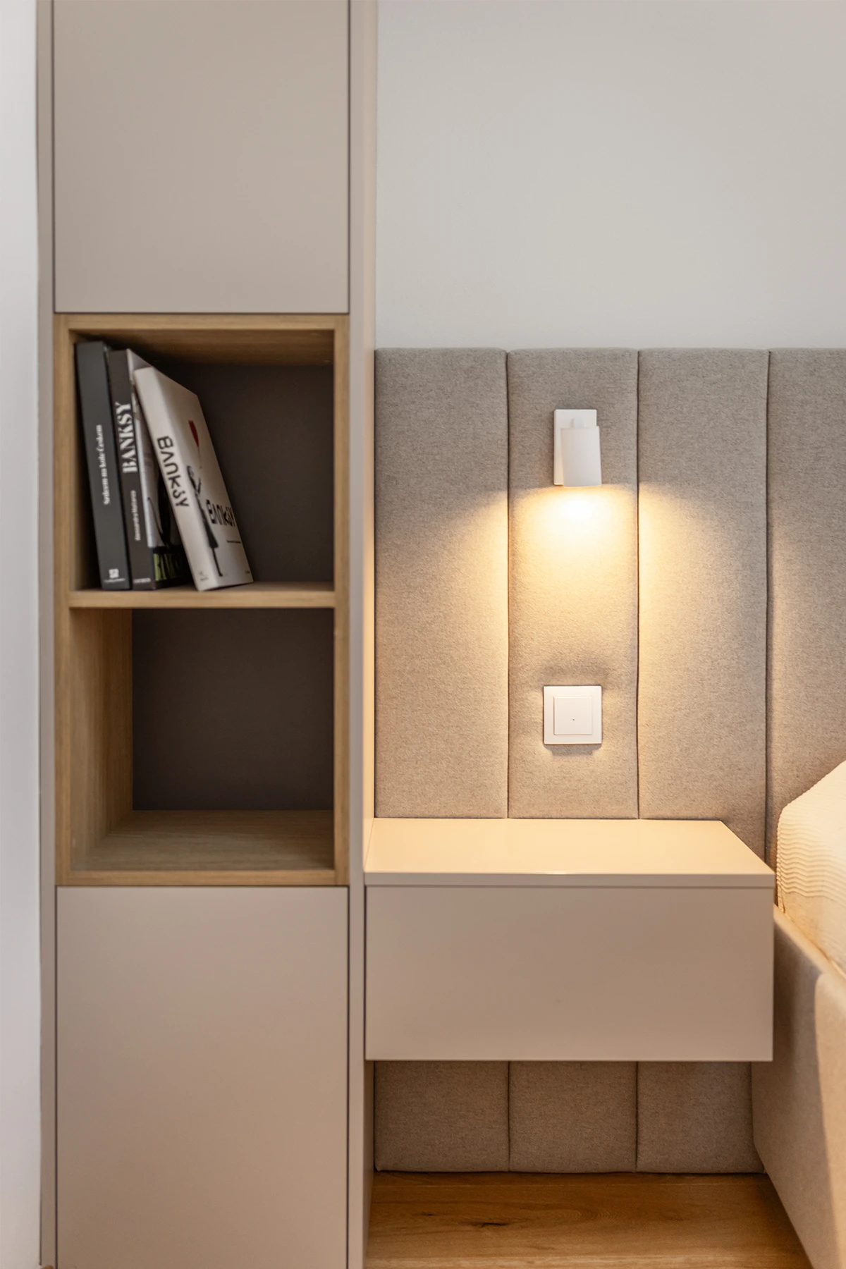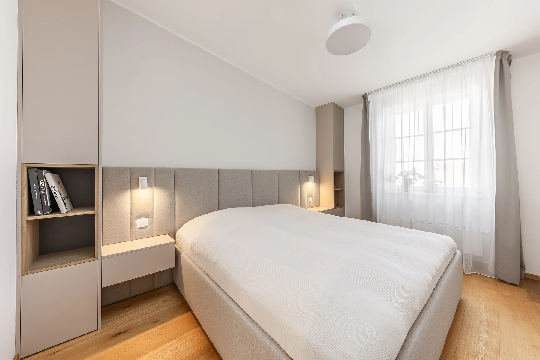 Stejný důraz na komfort a detail se propisuje i do klidové části bytu. Dominantou ložnice je čalouněná postel se širokým čelem, navržená a vyrobená na míru tak, aby prostor působil měkce a harmonicky.