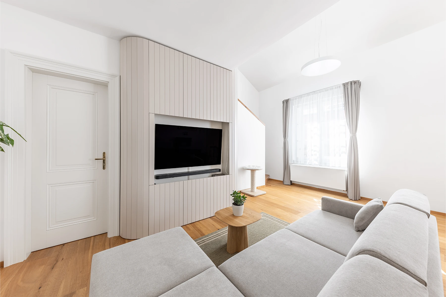 Dominantou obývacího pokoje je oblá lakovaná knihovna sahající až do patra. Skrývá televizor za roletou, pojme velké množství věcí za zavřenými dvířky a svým tvarem zároveň zjemňuje celý prostor. Podobný princip jsme uplatnili i v předsíni – botník v sobě nenápadně ukrývá i zázemí pro kočku. Každý centimetr má své místo, nic nepůsobí navíc.